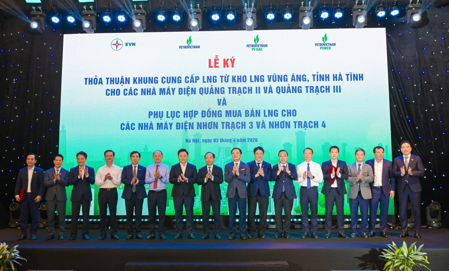 Ngày 03/4/2026, tại Hà Nội, Tổng công ty Khí Việt Nam (PV GAS) cùng Tập đoàn Điện lực Việt Nam (EVN) và Tổng công ty Điện lực Dầu khí Việt Nam (PV Power) đã ký kết các thỏa thuận quan trọng về cung cấp khí thiên nhiên hóa lỏng (LNG) cho các dự án điện khí quy mô lớn.